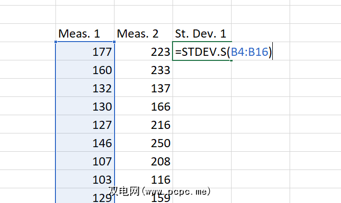 要确定集合的标准差,只需键入 = STDEV。 S()或 = STDEV.P(),然后将数字范围插入括号中。您可以单击并拖动或键入范围。