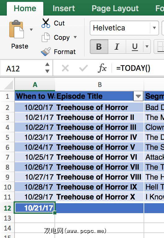 我已经添加了计划观看每一集的日期。在另一种情况下,您可以添加特定任务的截止日期。在该列的底部,我使用了= TODAY()来生成一个始终显示当前日期的单元格。