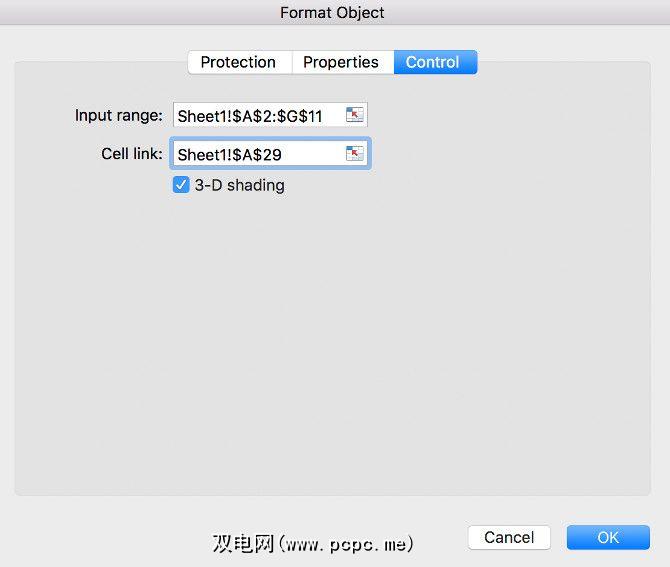 对于输入范围,输入要从中绘制的单元格范围,对于 Cell链接,输入我们添加了数字的单元格。在这两种情况下,请记住为它们所在的工作表添加引用。