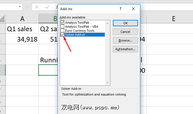 在出现的窗口中,您会看到一些选项。确保选中了 Solver加载项旁边的框,然后点击确定。