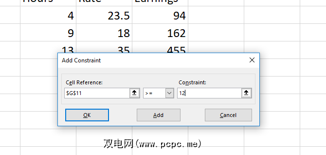 要添加约束,请单击约束列表旁边的添加按钮。您会看到一个新窗口。在 Cell Reference 字段中选择要约束的一个或多个单元格,然后选择一个运算符。