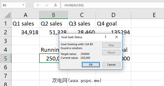 在我们的案例中,解决方案是135,294套。当然,我们可以通过从年度目标中减去运行总额来发现这一点。但是,Goal Seek也可以用于已经有数据的单元格中。