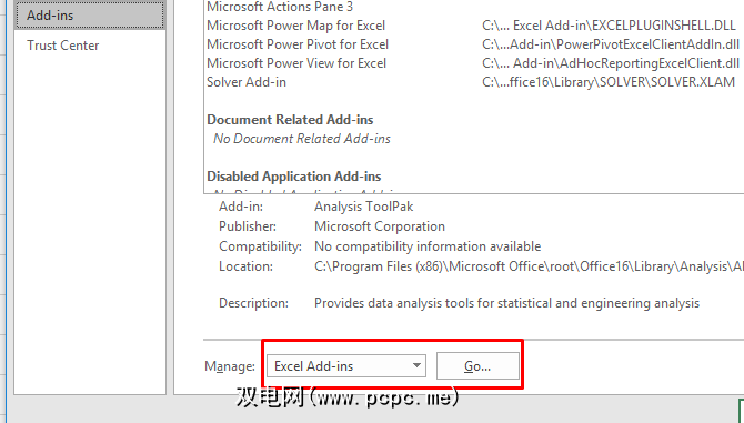转到文件>选项>加载项。然后单击管理:Excel加载项旁边的转到。