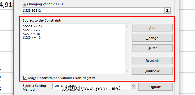 而且它在约束内起作用,因此,如果一个变量不能更改,或者只能在指定范围内变化,则Solver会将其考虑在内。