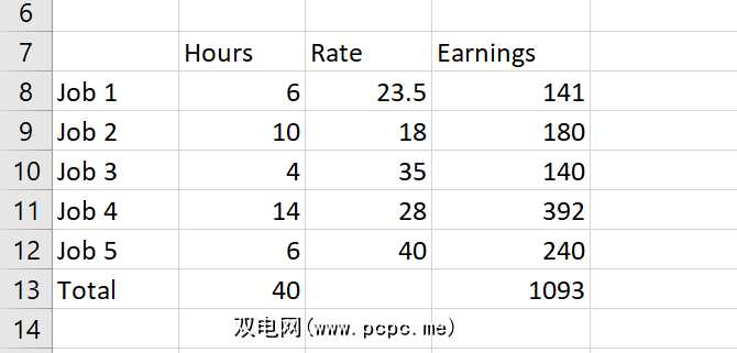 其中有五个不同的工作,每个工作的薪资不同。我们还提供了理论工作者在给定的一周内完成这些工作的小时数。我们可以使用Solver加载项来找出如何在使某些变量保持在某些约束范围内的同时最大化总薪酬。
