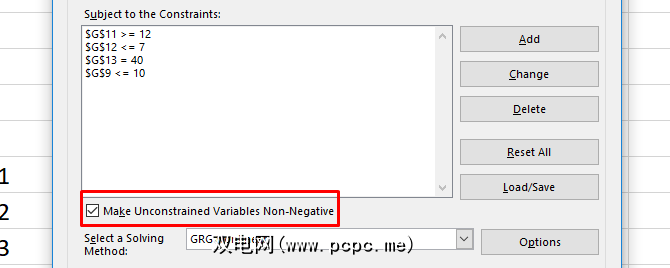 您还可以使用“求解器"主窗口中的复选框来确保未指定约束的所有值均为非负值。如果您希望变量变为负数,请取消选中此框。