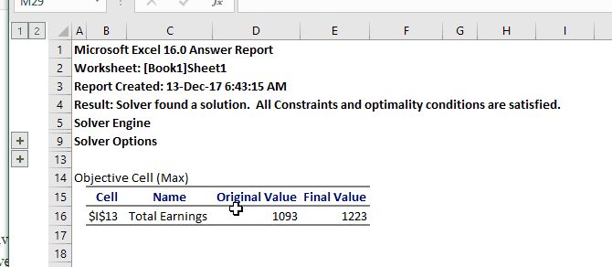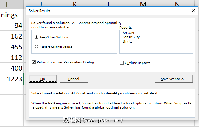 Solver找到了解决方案!正如您在上方窗口左侧所看到的,我们的收入增加了$ 130。并已满足所有约束条件。