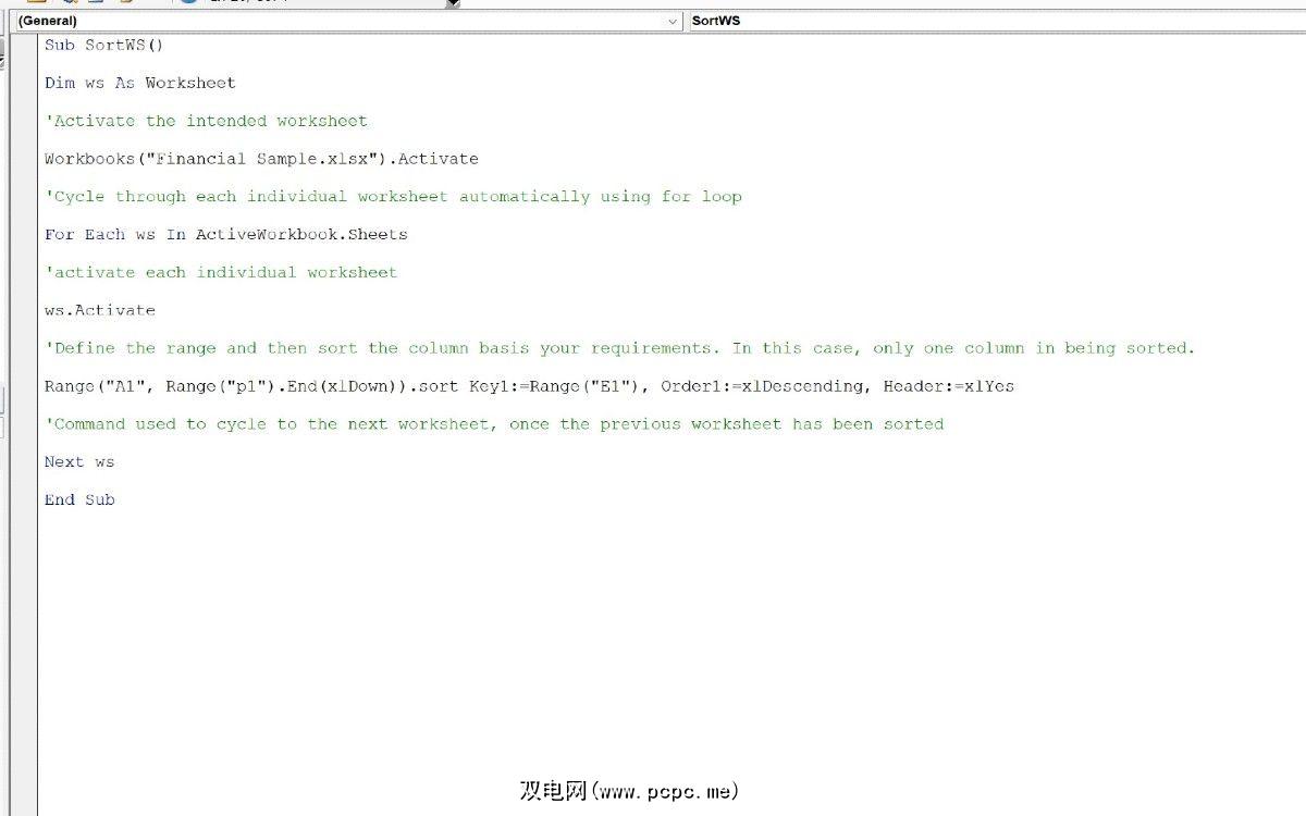 下面代码的目的是循环浏览工作簿中的每个可用工作表,并根据指定的列对可用数据进行排序。