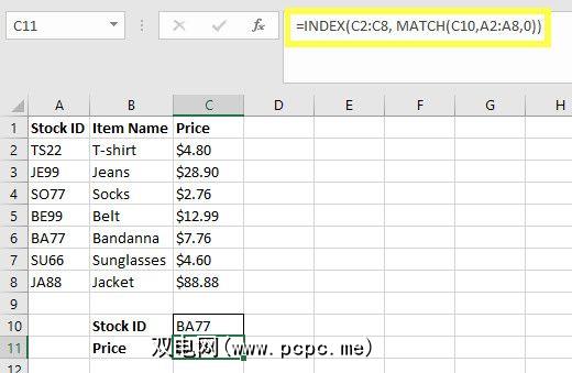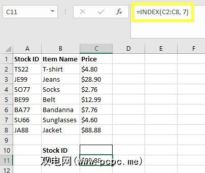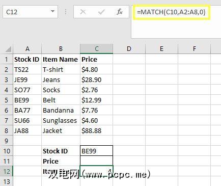 您已经看到,我们已经指定包含每个项目价格的单元格范围, C2:C8 。在这种情况下,我们知道我们要查找的单元格位于倒数第七行。但是,我们可以使用MATCH函数替换此信息,这将使我们可以通过在单元格C10中输入“库存ID"来查找特定的单元格。