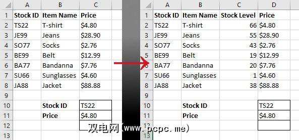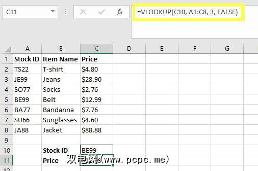 当我在单元格 C10 中输入库存ID标签时,单元格 C11 更新为相应的价格。这是因为它将对照我们指定范围 A1:C8 中包含的单元格,检查 C10 中的字符串。公式中的 3 告诉Excel,我们正在第三列中查找单元格,因为我们正在查找价格。最后,添加 FALSE 可以确保我们的公式仅返回完全相同的值,而不是近似匹配。