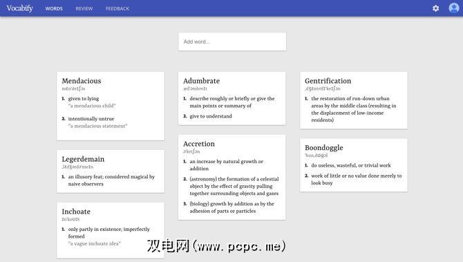 Vocabify借鉴了Google Keep类似卡片结构的设计元素。它可以帮助您直观地查看迅速发展的词汇库。