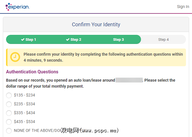 提交扫描请求后,您必须回答有关最近信用活动的一些问题,以进一步确认谁你是。然后,您必须创建一个安全问题和PIN码-确保明智地回答安全问题。