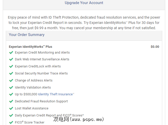 Experian的“建议措施"都围绕您付款公司提供更多服务。它希望您注册以进行更多监视,甚至付费以访问您的信用评分(您可以在其他地方免费获得)。
