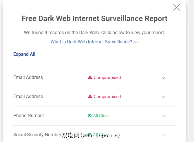 几秒钟后,我得到了扫描结果。据Experian所说,我的电子邮件地址被盗用,但是我的社会安全号码和电话号码很清楚。