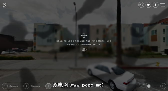 该活动创造性地利用了Google街景视图,因为它覆盖了任何人的眼睛损伤您使用街景视图选择的位置。例如,您可以选择您的邻居地址,并获得白内障患者的感受。 “严重程度滑块"模拟了损害的程度。