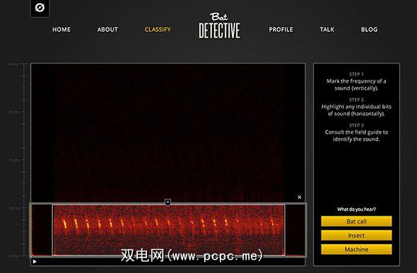 蝙蝠的研究不是但是非常容易,就像上面的Whale.fm一样,此项目依赖于声音和声音的可视化来进行识别。由于蝙蝠使用声音来定向自己,寻找食物和交流的方式;他们被认为是非常嘈杂的生物。这为研究人员提供了很多数据,即使是最先进的计算机软件也无法帮助分类的数据。