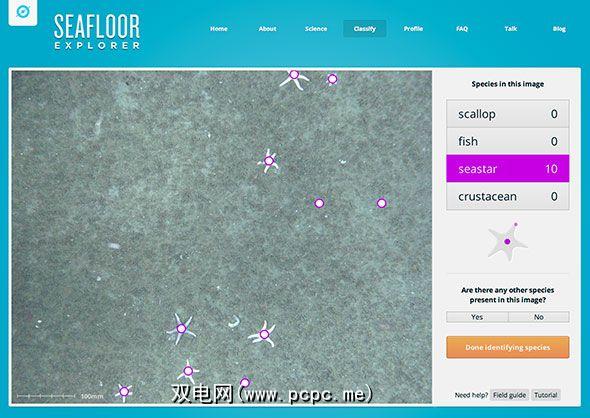 很像海底的Snapshot Serengeti资源管理器比其他两个基于声音的项目更易于使用,因为所有数据都是可视的。除了识别材料,巨石,贝壳和鱼,此过程还需要使用鼠标标记海星和扇贝等物种。如果您不太确定活扇贝和死扇贝之间的区别是什么,那么请不要担心文档和教程可以帮助您快速入门。