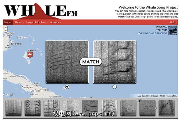 Whale.fm涉及将提供的未分类声音与屏幕底部的选择进行匹配。每一个都可以看作是一个频谱图,可以聆听,甚至有多种选择,可以使正确的声音略有变化。并非所有提供的声音都一定是鲸鱼,有些声音很难分辨,尤其是在远处。在样本中经常可以找到来自过往船只的声纳,无论是从源头还是从海底弹起。