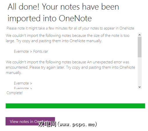 文件已完全移走。现在,您将(希望)看到所有完成!通知,以及无法转移的所有音符的列表。似乎我的巨大字体文件夹对于OneNote来说太大了。嗯…。然后对微软采取行动。