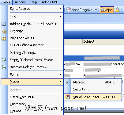 我们在这里要做的所有事情都在VBA中。在Outlook中,通过单击“ 工具",然后单击“ 宏",然后选择“ Visual Basic编辑器",进入VBA编辑器。 。