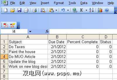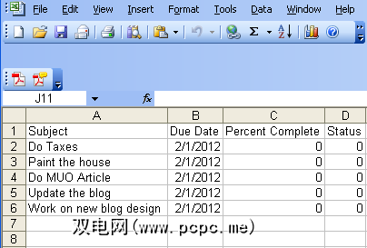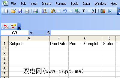 因此,新电子表格的外观如下。您的Outlook应用程序刚刚在C:\ temp目录中创建了一个名为“ MyActiveTasks.xls"的新Excel文件,并为您要插入的任务创建了标头。