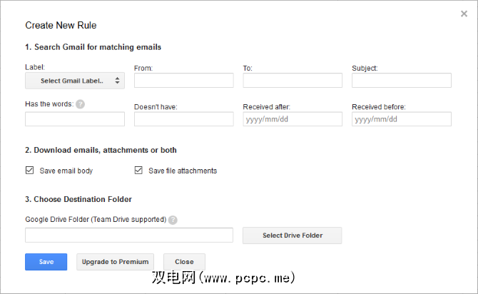 您可以在此处定义特定的过滤器,例如发件人,主题和接收日期。如果只需要附件,请使用标签下拉列表选择收件箱,仅勾选保存文件附件,然后单击选择驱动器文件夹选择目标文件夹(如果没有现有文件夹可供选择,则需要在云端硬盘上创建一个文件夹)。完成后,点击保存。