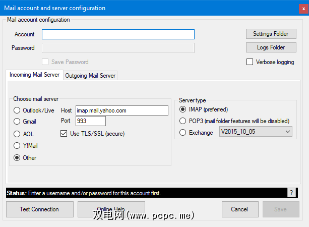 下载ZIP,解压缩并在其中运行安装程序。点击设置。在这里,您可以选择邮件服务器,以便任何人提供您的电子邮件,然后输入帐户和密码。请注意底部的黑条,因为它包含重要信息,例如,对于AOL,您需要在电子邮件设置中启用POP。