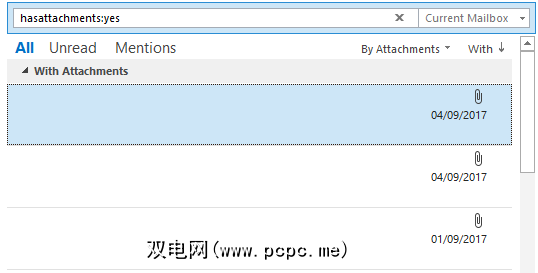 返回收件箱,搜索 hasattachments:yes 将电子邮件限制为仅那些有附件的人。 Outlook充满了诸如此类的便捷过滤技术。