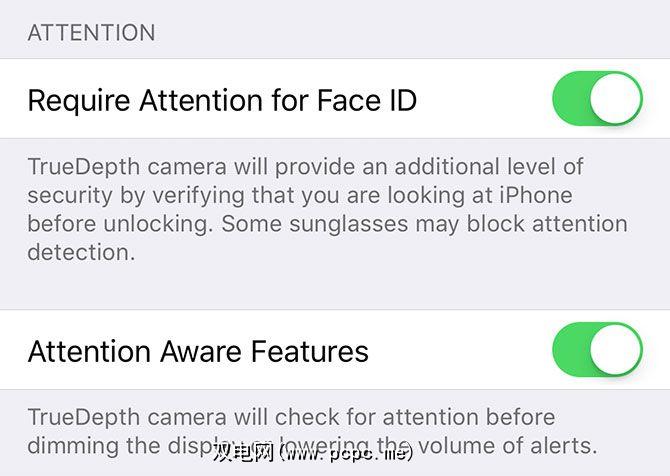 一种名为Attention的功能可检查是否您正在注视着设备,并在检测到您的视线之前一直防止屏幕变暗或锁定。如果您倾向于戴墨镜,则可以将其关闭,因为如果您的眼睛被遮挡,它将无法正常工作。