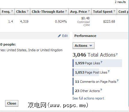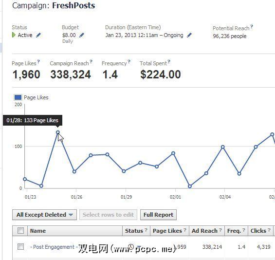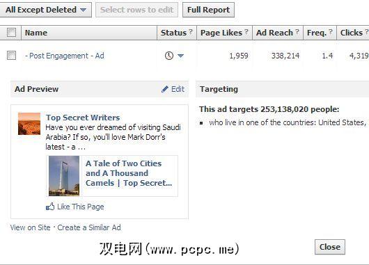 此外,Facebook还有不错的性能反馈报告。我在这里看到了一些大数字-报告了数十万次展示和数千次点击,但是要核实这些数字确实非常困难,因为这些点击是进入您的Facebook页面,而不是您的网站。