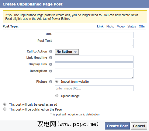显然,这些黑帖的创建方式不同作为常规状态更新。您需要使用Power Editor将每个更新创建为一个广告。前往facebook.com/ads/manage/powereditor,即可开始使用。确保您位于“管理页面"部分,然后单击要使用的页面。然后单击“创建帖子"以创建未发布的帖子。请确保选中“此帖子将仅用作广告"单选按钮,以免发布该帖子。