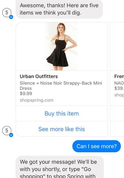 如果我们以电子商务Messenger bot为例,将有人来回答用户的任何问题。因此,用户可以使用内置工具浏览类别和项目。但是,只要他们输入一个问题,它就会传给实际的人。机器人不会尝试变得聪明,自己回答问题。