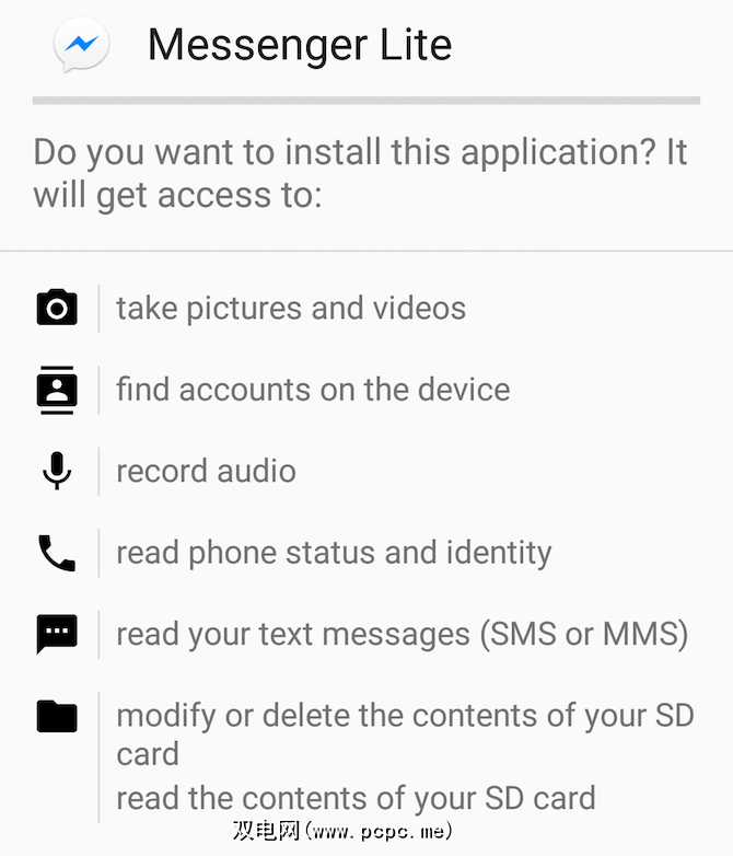 不幸的是,尽管我们希望Messenger Lite在权限方面会更好,但事实并非如此。我们已经知道Facebook Messenger会请求侵入权限,Messenger Lite也是如此。它仍然可以访问类似的区域,例如联系人身份,阅读短信,控制摄像头和麦克风以及从SD卡读取或删除数据。