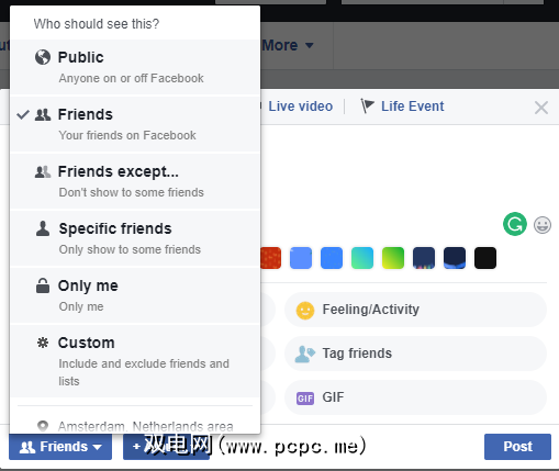 您有六个选项可供选择:公共,朋友,除以下之外的朋友(排除某些人),特定朋友,只有我和自定义。