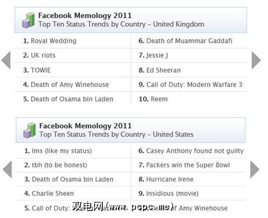 Facebook还发布了按国家/地区划分的热门趋势,其中包括14个国家/地区,以及发展最快的Pages和大多数这些国家的热门趋势从lms(如我的身份),皇家婚礼和木板到史蒂夫·乔布斯以及艾米·怀恩豪斯的去世不等。