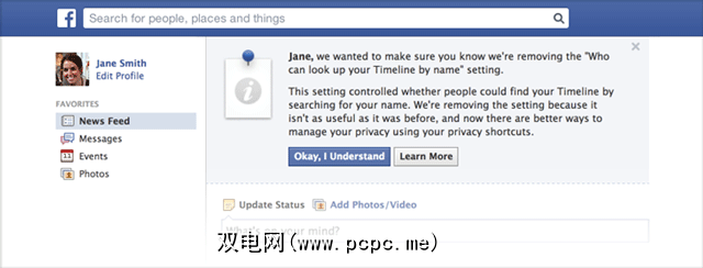 “谁可以按名称查找时间轴?" Facebook功能可通过顶部搜索栏中的搜索来缓和帐户的可见性。您可以决定是否要被所有人发现,还是有选择地对您的朋友和朋友的朋友保持可见。 Facebook的首席隐私官迈克尔·里希特(Michael Richter)说,这种隐私很容易出现毛病,因为人们仍然可以通过在新闻源中的一个故事中单击您的名字来进入您的时间轴。此外,这令一堆朋友或同一Facebook组中的朋友感到困惑,因为尽管他们彼此认识,但他们却无法通过搜索栏找到对方。启用了旧设置的任何人都应该看到以下通知: