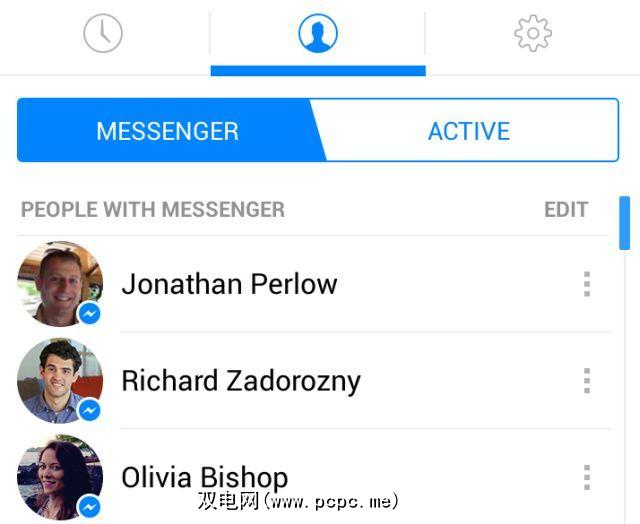您会在某些用户的个人资料照片旁边看到一个新图标,看起来像一个蓝色圆圈中的“〜"。这表明该联系人也正在使用Messenger for Android应用程序,并且会立即将您的消息通知您。