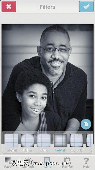 多种滤镜用于改变人像的整体温度和色调,应用一种或多种照明效果(例如,较浅,较暗,S曲线,温暖,较冷),以及各种镜框和镜头效果(例如,Holga,Diana, Lensbaby,鱼眼,扭曲)。但是请注意,该应用程序实际上并没有直接的曝光和对比度校正工具,例如您在ProCamera或Camera +中找到的工具。