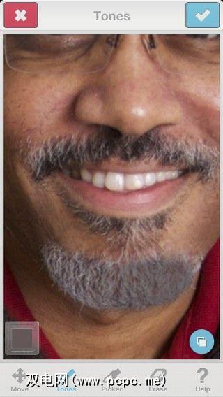 在我留着灰胡子的情况下,该应用程序是太暗了,据我所知您无法创建所选颜色的渐变,尽管FaceTune包含了多种固定颜色供您选择。看来您也无法调整“色调"工具的大小和硬度,这也使我很难加深胡子。