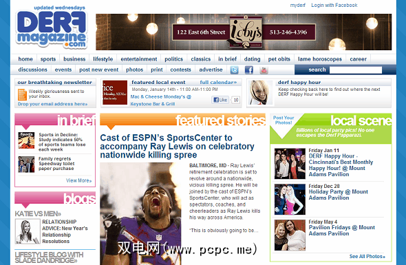 Derf Magazine提供了另一种类型,每周以一种生活方式出版物的形式出版。 Derf的总部位于辛辛那提(Cincinatti),因此有许多针对该城市的本地内容,但是大多数印刷版和网络上出现的文章对美国其他地区和其他地区也有意义。有很多不同的部分,例如体育,政治和娱乐,还有一些非常有趣的星座运势和宠物ob文,甚至是金鱼。