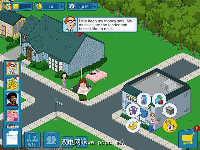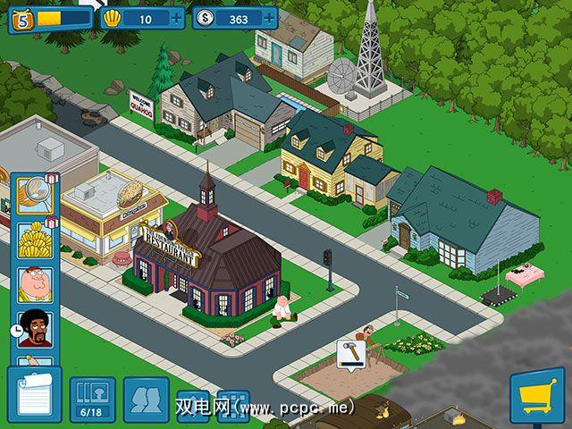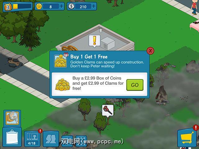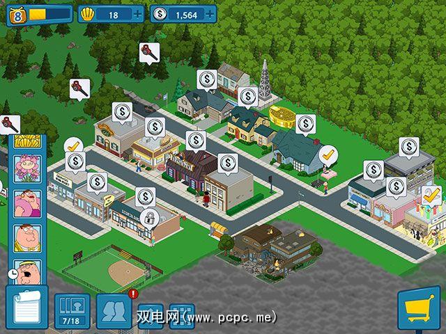 核心游戏涉及点按生成XP的建筑物和硬币(标准的非高级应用程序内货币),将基于时间的任务分配给角色并构建更多Quahog。 TinyCo的视觉开发人员不可轻描淡写-各种任务的角色动画看起来很棒,建筑物根据内部活动进行动画处理和变化,使用的视觉样式和调色板可以说比EA通过Tapped Out实现的效果更好