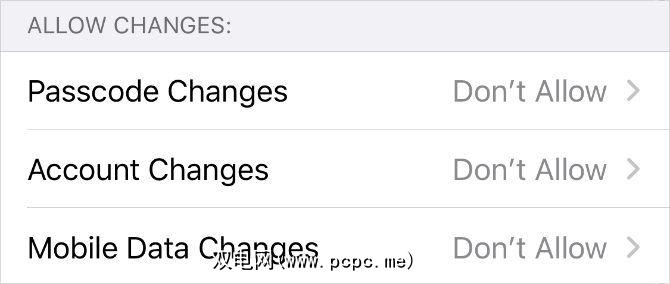 “允许更改"部分可让您锁定孩子设备上的特定设置,例如密码,帐户和移动数据设置。您可能希望将这些选项设置为不允许,以防止您的孩子退出其孩子帐户并创建要使用的成人帐户。