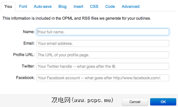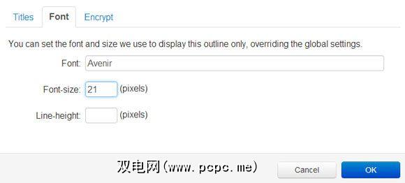 您可能想知道如何更改文档的字体样式和大小。使用Fargo,您可以获得更广泛的字体样式,也就是说,如果您知道要使用的字体样式的名称。单击文件>轮廓设置 ...",然后输入要使用的字体样式和大小。 (我喜欢第一天日记应用程序中使用的简洁Avenir字体。)