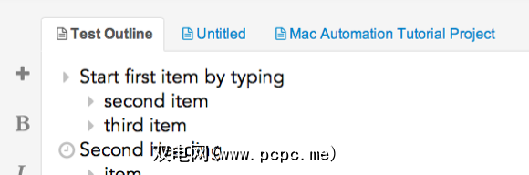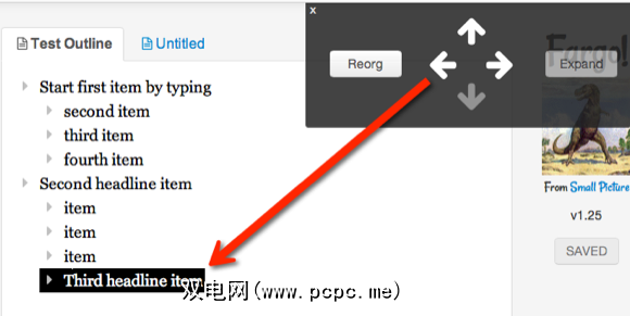 创建轮廓时,您可以先键入所有可能的顶级标题。要在Fargo中执行此操作,请在每个标题后均按Return键,然后返回到每个标题以添加子项。为了在子项目列表之后添加新的顶级标题,最好将新标题输入为子项目,选择它(通过单击该项目的箭头),然后简单地按Shift键即可。 + Tab键可将项目向左移动。 (注意:与Mac上经常使用的应用程序一样,我在BetterTouchTool中映射快捷方式以更快地激活菜单项。)