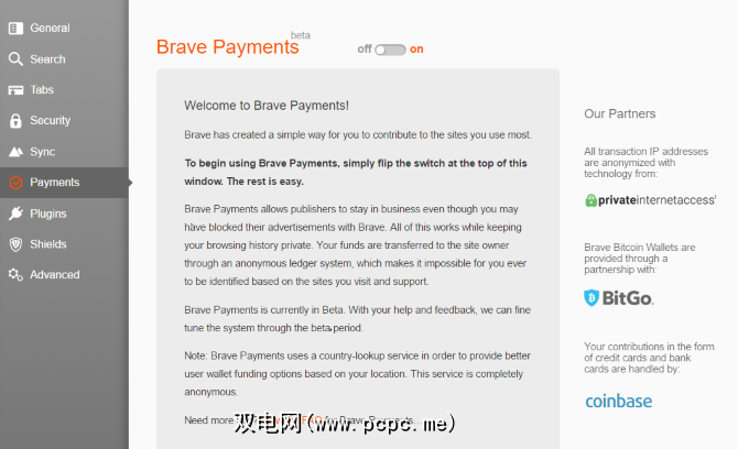 如果选择付款,则可以使用信用卡/借记卡或比特币来添加资金。在浏览时,付款页面将收集有关您访问哪些网站以及您在这些网站上花费了多长时间的数据。如果您访问不想支付的网站,则可以将其关闭。在每个月末,Brave都会拿走您提供的钱,并根据您访问最多的网站进行分配。
