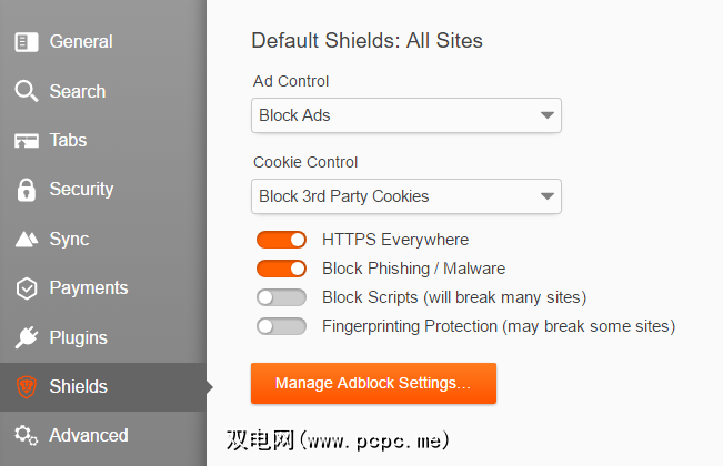 在其标签上设置默认的 Shield 设置。您可以选择屏蔽广告(默认设置),允许广告和跟踪或显示勇敢的广告。勇敢者默认会阻止第三方Cookie ,但您也可以选择允许所有cookie或也阻止所有cookie。它还包括HTTPS Everywhere(一项基本的安全扩展),默认情况下内置并已准备就绪。