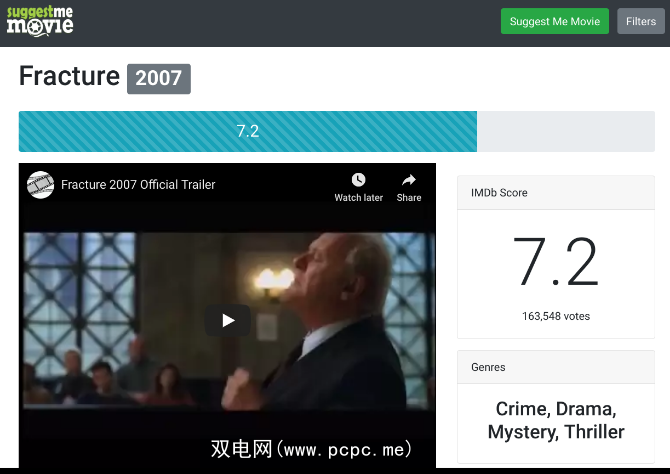 无需搜索或单击“建议我看电影"。打开网站,您将获得新的电影推荐,包括其IMDb评级,预告片,流派以及有关剧情和演员表的详细信息。就像经典的StumbleUpon网站一样,但仅适用于电影。