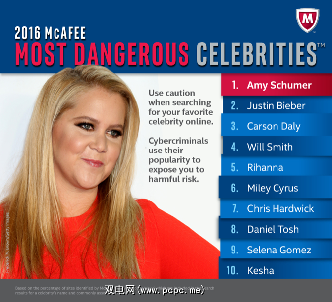 此列表到底是什么意思?迈克菲说,它着眼于哪些名人的名字“产生了最危险的搜索结果,可能使粉丝暴露于病毒和恶意软件中。"因此,简而言之,如果您要搜索艾米·舒默,贾斯汀·比伯,卡森·戴利或其他任何人列表中,您很有可能看到其中一个结果,其中可能充满了恶意软件。