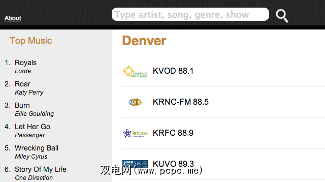 RadioSearchEngine利用了这一事实以及这些电台提供的歌曲元数据,使立即听到前40首歌曲成为可能。转到该站点,您会在当前热门歌曲列表的右侧看到我们的本地电台: