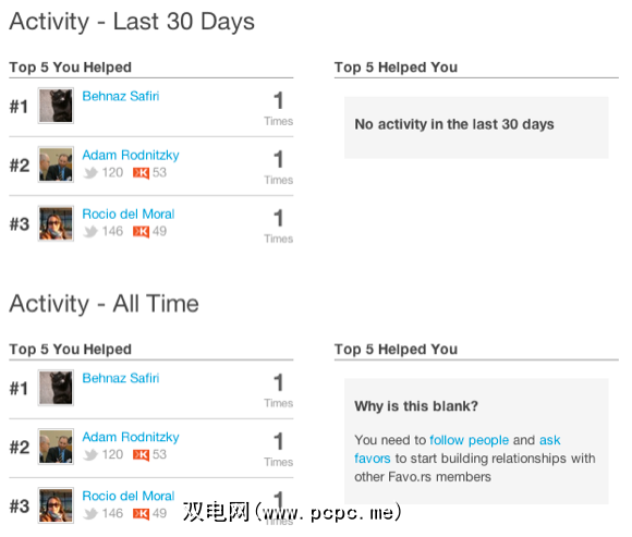 如果您发现自己在Favo.rs上变得非常活跃,则可以使用活动仪表板获取概述了前5天中最有用的5个数字,您曾经帮助过的前5名用户以及过去30天帮助过您的前5名用户。